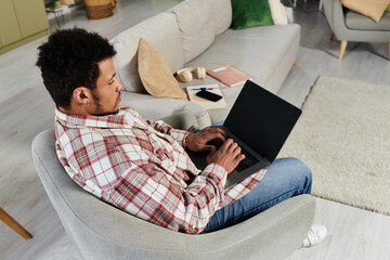 Handsome young man is seated comfortably on a couch using a laptop while focused on his work.