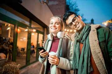 Young handsome man using smartphone in a city. Smiling student man looking at mobile phone. Coffee break. Modern lifestyle, connection, business concept