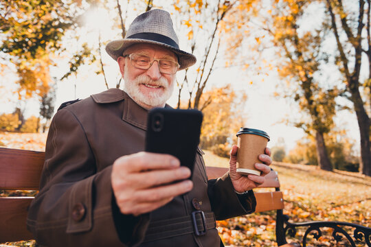 Senior man enjoying autumn day at the park with coffee and smartphone under colorful foliage