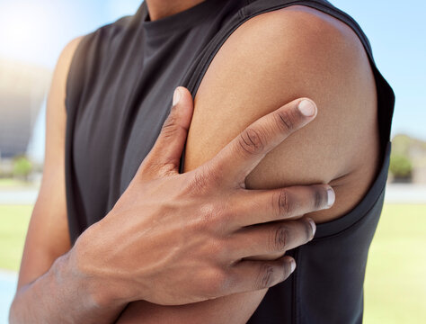 Closeup of african american sportsman suffering from shoulder pain while training. Zoomed in on unknown black man holding and rubbing sore arm with. Overworking muscles causing tension