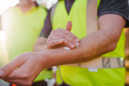 Construction worker on a blurry background rubbing sunscreen lotion on his arm.
