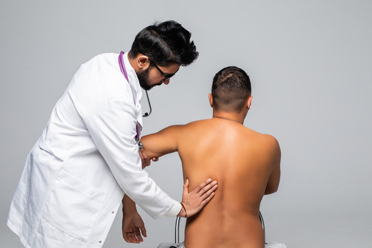 Young indian male doctor and patient suffering from back pain during medical exam.