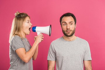 unhappy crying frightened woman, aggressive man shouting at home. Angry husband emotionally arguing screaming shouting to scared wife, verbal abuse, domestic violence relationship