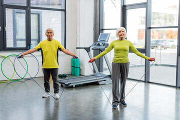 Senior woman training with jump rope near asian friend in sports center.