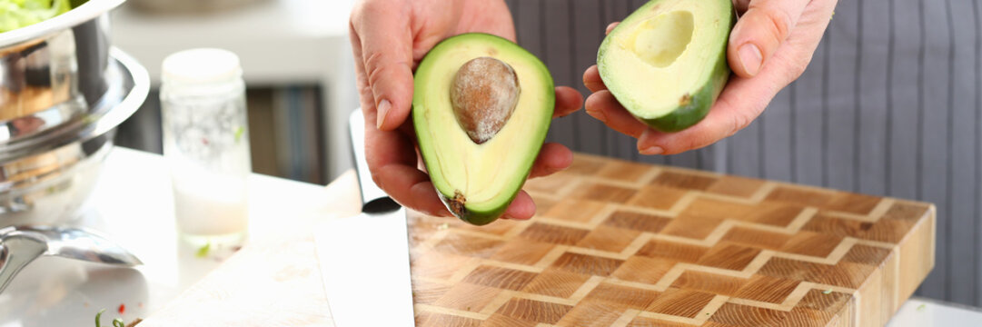 Male Hands Holding Green Avocado Fruit Halves. Chef in Apron Showing Cut Tropical Ingredient with Brown Seed. Man Cooking Food on Wooden Board in Kitchen. Culinary Recipe Horizontal Photography