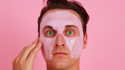Young man applies cream mask on face has beauty session, wears bath cap,  isolated over pink background. Facial treatment, man skin care concept.