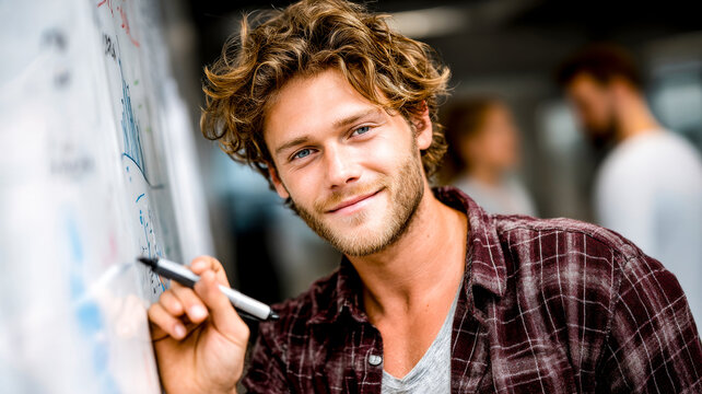 A smiling young man with curly hair is actively writing on a whiteboard during a meeting or brainstorming session in a modern office