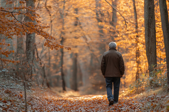 Serene autumn walk in forest, man walking on leafy path, enjoying tranquility, golden foliage, peaceful nature, fall retreat, autumn strolling concept