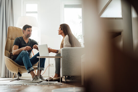 Side view of a couple talking sitting on a couch and looking each other at home.