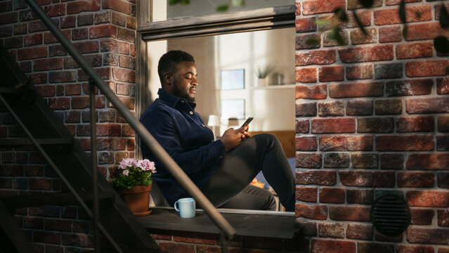 Handsome millennial young African freelance man typing on smartphone, sitting on home couch, using application on gadget, working on business tasks from urban city apartment