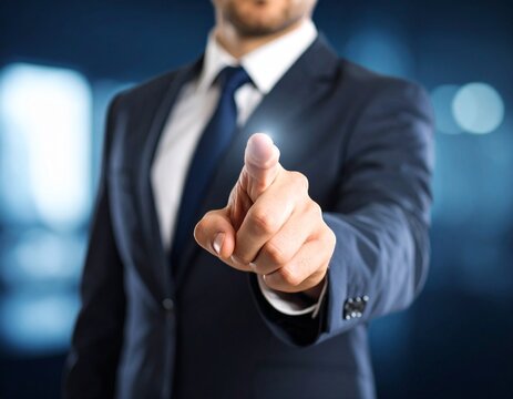 Close up of a man's hand touching an invisible screen, suit and blue shirt. Interaction concept