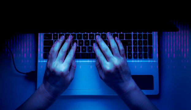 Man Typing Laptop Analyzing Malware Binary Code Images