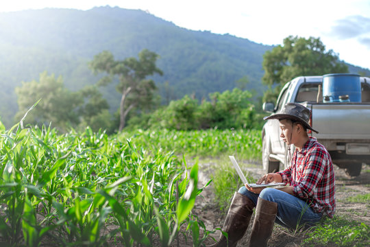 Young farmer sitting and checking his corn field with use laptop computer processing, Agribusiness concept.
