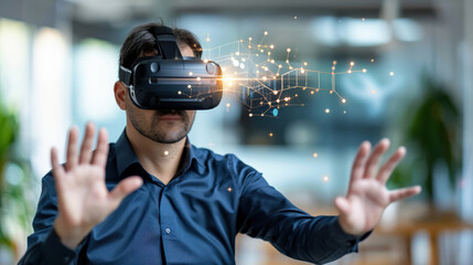 person wearing virtual reality headset interacts with digital interface, surrounded by abstract geometric shapes and glowing connections, suggesting advanced technology use