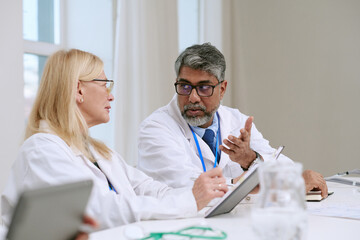 Middle aged Caucasian woman and middle aged South Asian man discussing medical information at table, both wearing lab coats and using digital tablet during professional meeting