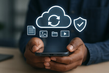 Man using smartphone for cloud storage backup with digital data synchronization icons in modern secure technology concept interface