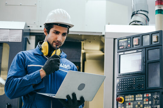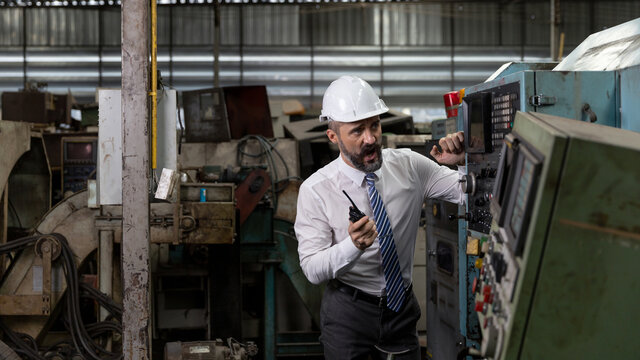 Male industrial engineer or technician in safety hard helmet and uniform using laptop checking on machine and radio phone calling team worker, heavy technology invention industry manufacturing factory