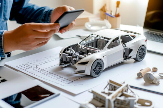 Car mechanic inspect engine, use a laptop and mobile phone in garage