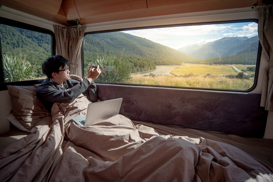 Adult man use laptop computer to work inside camper van with roaming phone connection. Concept of modern people lifestyle in smart working or travel digital nomad freedom
