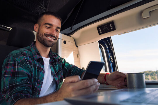 smiling young man using his mobile phone and laptop from his camper van in the middle of nature, concept of freedom and digital nomad lifestyle