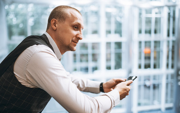 A serious mature businessman in a plaid vest is typing a message via the cellphone while leaning against the chrome railing of a balcony indoors of a modern office with a copy space place on the right