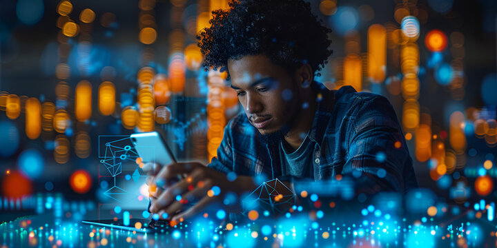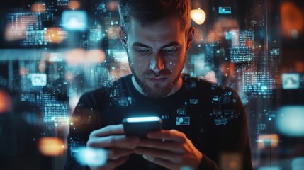 A focused man using a smartphone at night, surrounded by glowing data and technology icons, representing digital innovation.