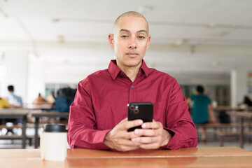Man using mobile phone at outdoor cafe restaurant in university area with takeaway coffee