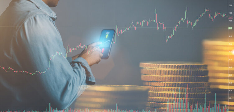 Modern man using smartphone analyze investment in stock market. Growth graph chart and overlay of gold coins on background screen. Financial and business investment concept.