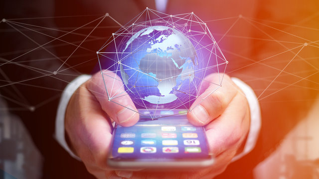 Businessman using smartphone with a Connected network over a earth globe concept on a futuristic interface - 3d rendering