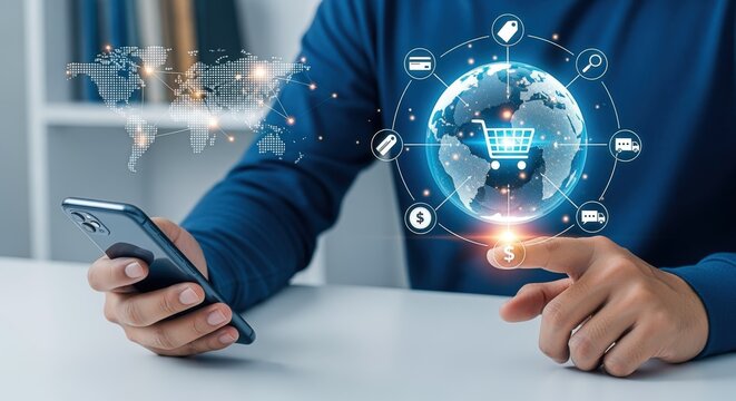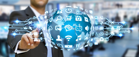 Businessman with phone in hand, hologram of earth globe and digital icons