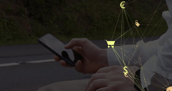 Man Using Smartphone With Digital Network Graphics Overlay Images