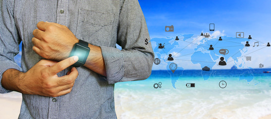 Social network communication.Global network connection concept.Businessman touching smart watch global big data.Global digital connections with technology.