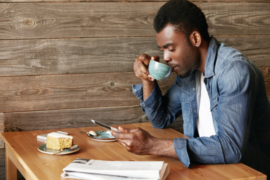 Handsome black male in casual wear checking email or reading world news on digital tablet computer drinking morning cappuccino, sitting at the wooden table at a cozy cafe. Connection and technology