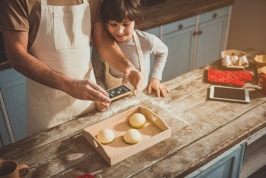 Father and child standing in kitchen and making snapshot of sweets on tray. Copy space in right side