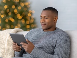 Online shopping for Christmas. Mockup of a tablet for the presentation of a website or application. A black man holds a tablet with a white blank screen against the background of Christmas decorations
