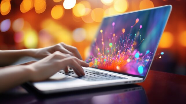 Close-up of hands working on a laptop in a well-lit office, with lots of space around for overlay text.