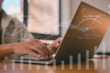 investment financial concept Business finance data analytics graph.Financial management technology.Advisor using KPI Dashboard on virtual screen, man using computer laptop working with data charts