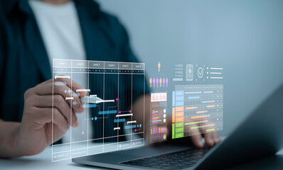 Man using laptop and digital pen with project management dashboard gantt chart and workflow analytics. Concept of business planning productivity teamwork strategy and digital organization system
