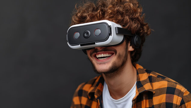 Man using virtual reality headset with digital interface