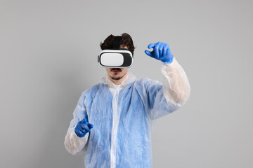Modern technology. Doctor using virtual reality headset on grey background