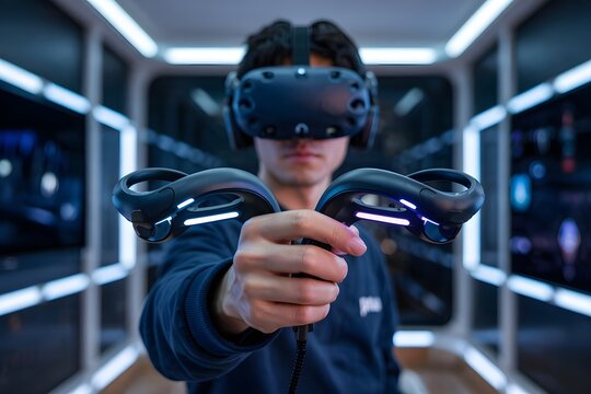 Close-up of a young man wearing a virtual reality headset, using hand gestures to interact with a futuristic digital interface, surrounded by glowing blue and red lights