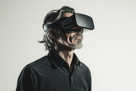 Man using virtual reality headset with glowing digital interface, white isolate background.