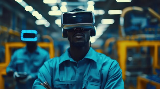 Man wearing VR headset in modern factory using virtual reality technology for controlling robotics