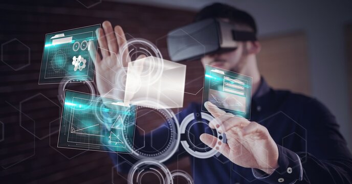 A young adult man experiences virtual reality using a headset, surrounded by vibrant digital elements and futuristic graphs, symbolizing innovation and engagement in technology. Raster