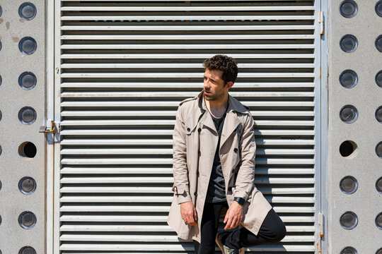 Smiling bearded man using smartphone while waiting at bus station in urban city environment