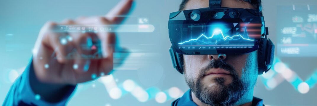 A man wearing a VR headset interacts with digital graphs, showcasing the blend of technology and data analysis in a futuristic setting.