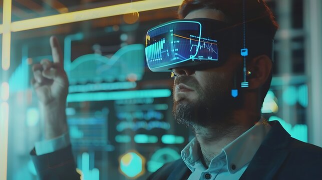 Business man in a virtual reality headset interacting with digital screens displaying stock market data and graphs integration of VR technology for financial trading