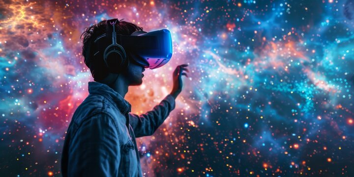 Man wearing a VR headset, interacting with vibrant cosmic data streams. The dynamic background features colorful nebulae and star-filled space, highlighting a futuristic digital experience