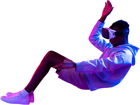 Teenage boy immersed in virtual reality experience wearing vr headset