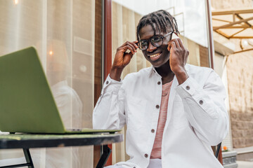 Black man working at cafe with laptop. Young confident man talking on the mobile phone while sitting at cafe